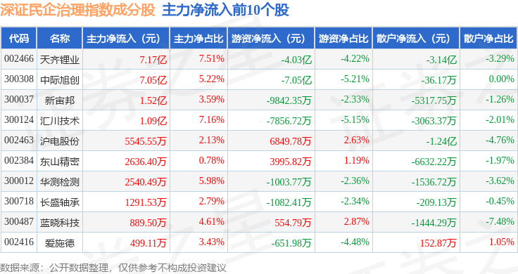 资金流向方面,深证民企治理(970058)指数成份股当日主力资金净流出合计36.0亿元,游资资金净流入合计5.39亿元,散户资金净流入合计30.6亿元。成份股资金流向详情见下表: