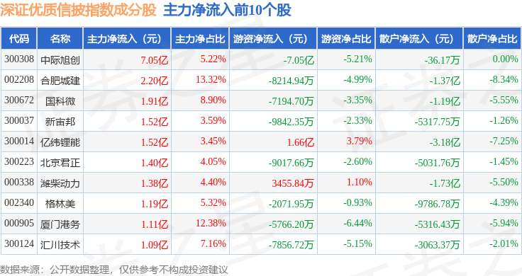 资金流向方面,深证优质信披(970065)指数成份股当日主力资金净流出合计124.73亿元,游资资金净流入合计29.53亿元,散户资金净流入合计95.21亿元。成份股资金流向详情见下表: