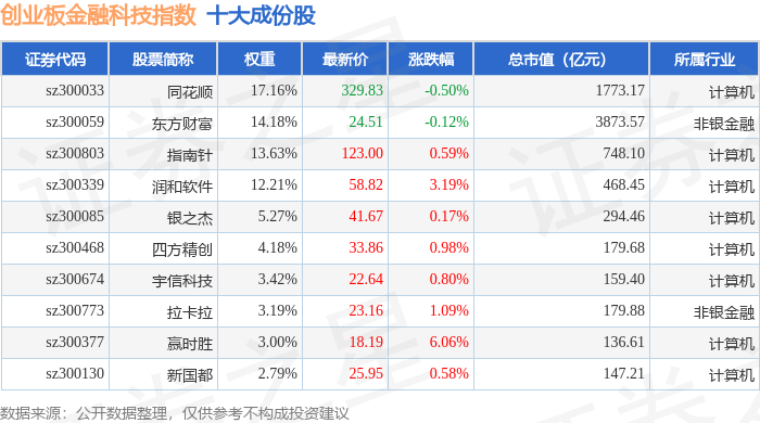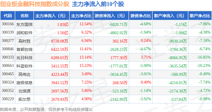 资金流向方面,创业板金融科技(970085)指数成份股当日主力资金净流入合计3047.11万元,游资资金净流入合计3563.23万元,散户资金净流出合计6610.34万元。成份股资金流向详情见下表: