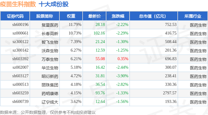 疫苗生科(980015)指数十大成份股详情如下: