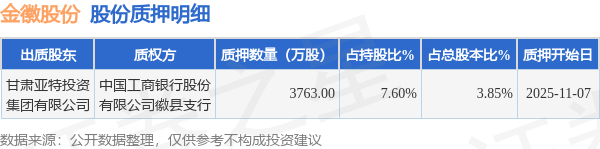 证券之星消息,金徽股份(603132)11月17日公开信息显示,股东甘肃亚特投资集团有限公司向中国工商银行股份有限公司徽县支行合计质押3763.0万股,占总股本3.85%。质押详情见下表: