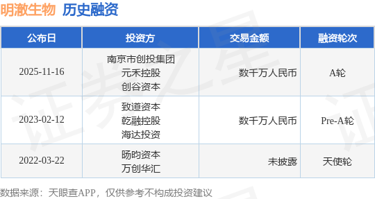 证券之星消息,根据天眼查APP于11月16日公布的信息整理,明澈生物科技(苏州)有限公司A轮融资,融资额数千万人民币,参与投资的机构包括南京市创投集团,元禾控股,创谷资本。