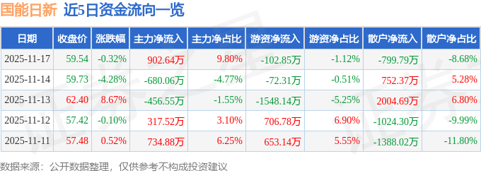 证券之星消息,截至2025年11月17日收盘,国能日新(301162)报收于59.54元,下跌0.32%,换手率1.82%,成交量1.55万手,成交额9209.55万元。