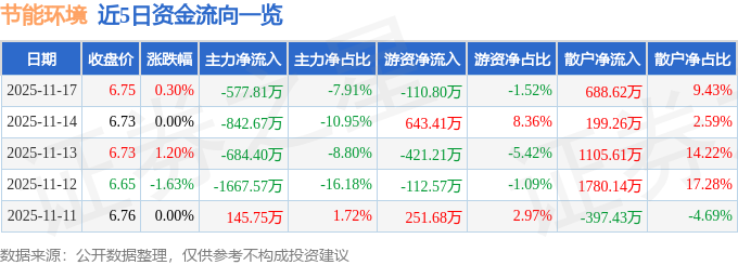 证券之星消息,截至2025年11月17日收盘,节能环境(300140)报收于6.75元,上涨0.3%,换手率1.07%,成交量10.89万手,成交额7302.01万元。