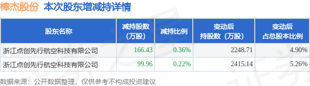 证券之星消息,11月17日棒杰股份发布公告《棒杰股份:关于持股5%以上股东减持股份至5%以下暨权益变动触及1%整数倍的公告》,其股东浙江点创先行航空科技有限公司于2025年9月8日至2025年11月14日间合计减持266.39万股,占公司目前总股本的0.5799%,变动期间该股股价上涨18.24%,截止11月14日收盘报5.64元。