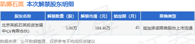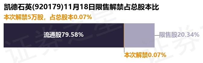 证券之星消息,根据市场公开信息整理,凯德石英(920179)于11月18日将有5.0万股限售股份解禁,为公司追加承诺限售股份上市流通,占公司总股本0.07%。(本次数据根据历史公告整理得出,实际情况以上市公司最新公告为准)最近一年内,该股累计解禁40.02万股,占总股本的0.53%。本次解禁后,公司还有1525.15万股限售股份,占总股本20.34%。具体如下图所示: