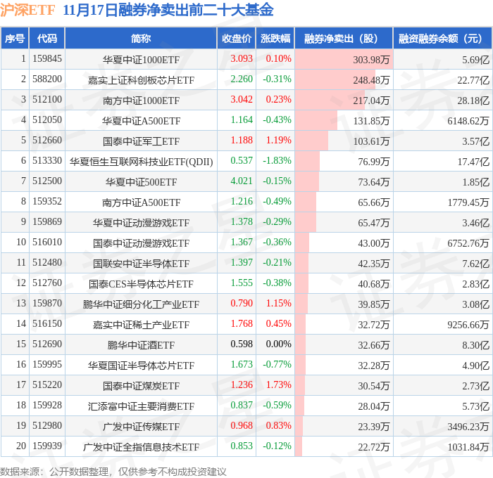 沪深ETF融券净卖出前三分别为:华夏中证1000ETF(159845)融券净卖出303.98万股、嘉实上证科创板芯片ETF(588200)融券净卖出248.48万股、南方中证1000ETF(512100)融券净卖出217.04万股,前20具体见下表: