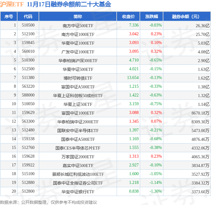 沪深ETF融券余额前三分别为:南方中证500ETF(510500)融券余额26.36亿元、南方中证1000ETF(512100)融券余额25.7亿元、华夏中证1000ETF(159845)融券余额5.03亿元,前20具体见下表: