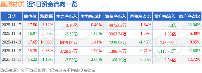 证券之星消息,截至2025年11月17日收盘,星源材质(300568)报收于17.5元,上涨3.12%,换手率14.41%,成交量175.87万手,成交额30.35亿元。