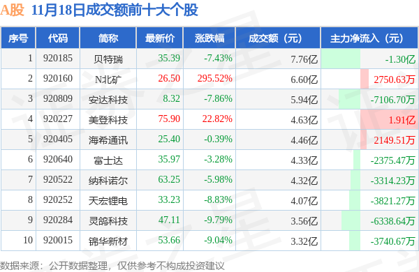 当日A股成交额前10大个股中2只个股收涨,平均涨幅159.17%,其中贝特瑞(920185)以成交额7.76亿元排第一。从主力资金流入看,成交额前10大个股中有3只个股呈现主力资金净流入。
