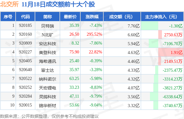 当日北交所成交额前10大个股中2只个股收涨,平均涨幅159.17%,其中贝特瑞(920185)以成交额7.76亿元排第一。从主力资金流入看,成交额前10大个股中有3只个股呈现主力资金净流入。