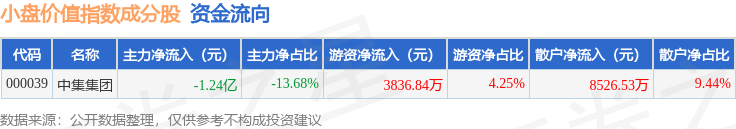 资金流向方面,小盘价值(399377)指数成份股当日主力资金净流出合计1.24亿元,游资资金净流入合计3836.84万元,散户资金净流入合计8526.53万元。成份股资金流向详情见下表: