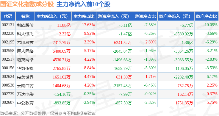 资金流向方面,国证文化(399397)指数成份股当日主力资金净流入合计14.27亿元,游资资金净流出合计5.63亿元,散户资金净流出合计8.64亿元。成份股资金流向详情见下表:
