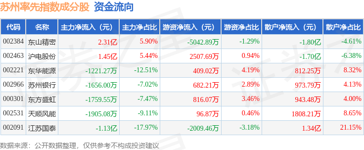 资金流向方面,苏州率先(399410)指数成份股当日主力资金净流入合计1.97亿元,游资资金净流出合计2540.5万元,散户资金净流出合计1.72亿元。成份股资金流向详情见下表: