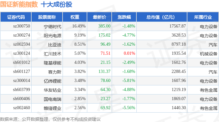 国证新能(399412)指数十大成份股详情如下: