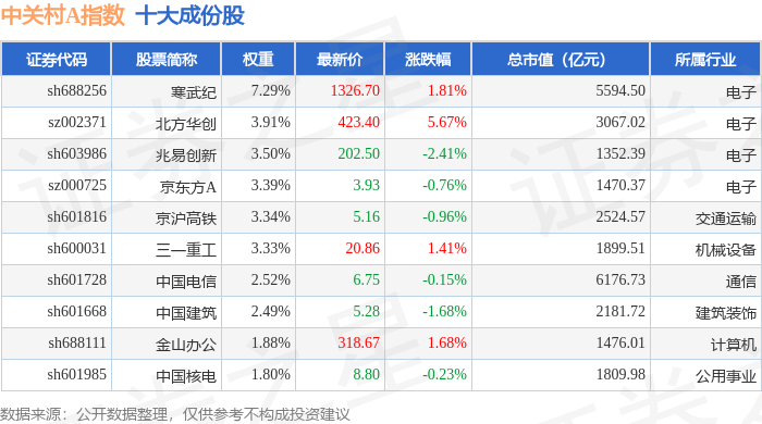 中关村A(399422)指数十大成份股详情如下: