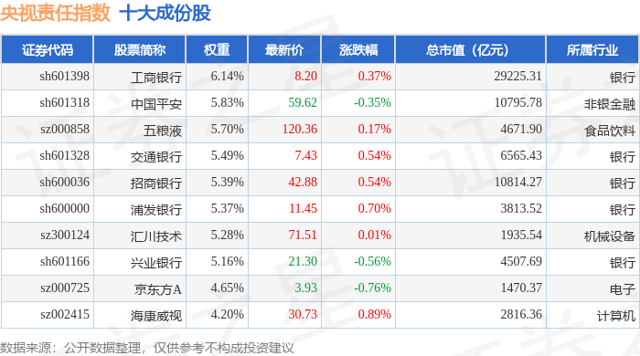 央视责任(399555)指数十大成份股详情如下: