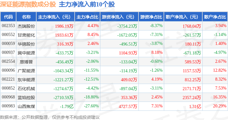 资金流向方面,深证能源(399613)指数成份股当日主力资金净流出合计4.9亿元,游资资金净流入合计1.03亿元,散户资金净流入合计3.88亿元。成份股资金流向详情见下表: