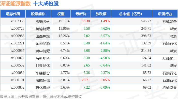 证券之星消息,11月18日,深证能源(399613)指数报收于3373.46点,跌2.39%,成交52.58亿元,换手率3.25%。当日该指数成份股中,上涨的有2家,杰瑞股份以1.49%的涨幅领涨,下跌的有11家,美锦能源以4.62%的跌幅领跌。