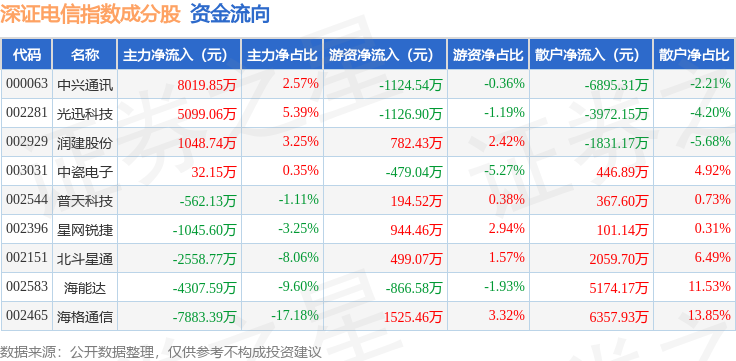 资金流向方面,深证电信(399621)指数成份股当日主力资金净流出合计2157.68万元,游资资金净流入合计348.88万元,散户资金净流入合计1808.8万元。成份股资金流向详情见下表: