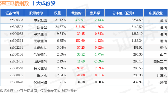 证券之星消息,11月18日,深证电信(399621)指数报收于9935.73点,跌0.28%,成交403.19亿元,换手率2.42%。当日该指数成份股中,上涨的有11家,长芯博创以2.39%的涨幅领涨,下跌的有11家,中际旭创以2.13%的跌幅领跌。