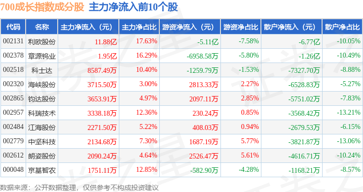 资金流向方面,700成长(399628)指数成份股当日主力资金净流出合计17.15亿元,游资资金净流入合计3.44亿元,散户资金净流入合计13.71亿元。成份股资金流向详情见下表: