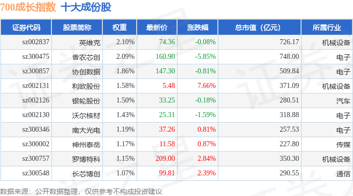 700成长(399628)指数十大成份股详情如下: