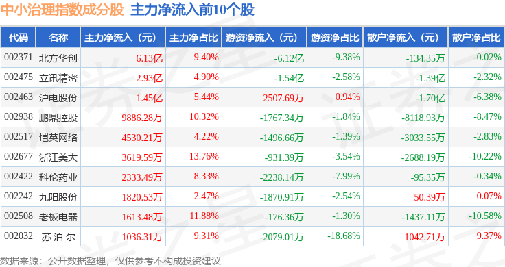 资金流向方面,中小治理(399650)指数成份股当日主力资金净流出合计14.29亿元,游资资金净流出合计2.71亿元,散户资金净流入合计16.99亿元。成份股资金流向详情见下表: