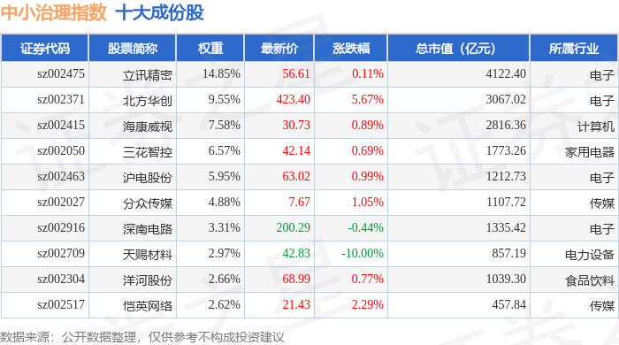 证券之星消息,11月18日,中小治理(399650)指数报收于2511.82点,涨0.09%,成交442.12亿元,换手率1.35%。当日该指数成份股中,上涨的有16家,北方华创以5.67%的涨幅领涨,下跌的有34家,天赐材料以10.0%的跌幅领跌。