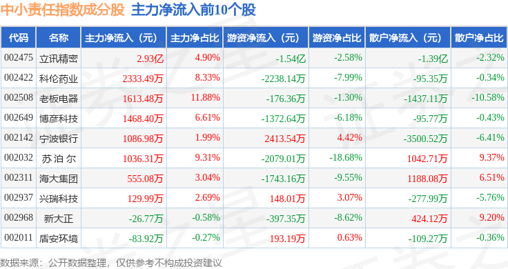 资金流向方面,中小责任(399651)指数成份股当日主力资金净流出合计41.03亿元,游资资金净流入合计10.85亿元,散户资金净流入合计30.18亿元。成份股资金流向详情见下表: