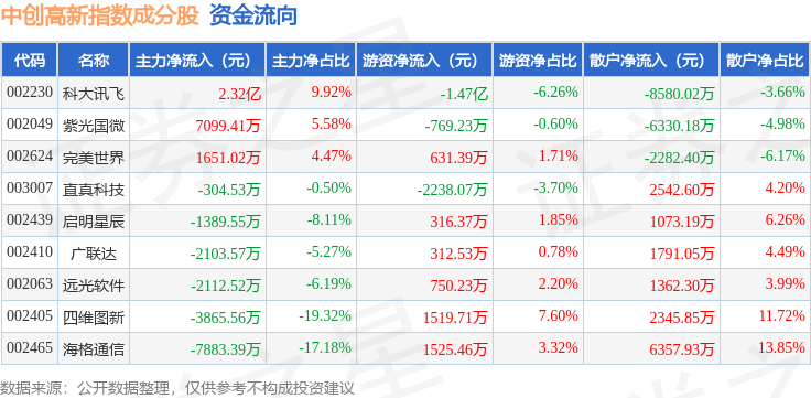 资金流向方面,中创高新(399652)指数成份股当日主力资金净流入合计1.43亿元,游资资金净流出合计1.26亿元,散户资金净流出合计1719.69万元。成份股资金流向详情见下表: