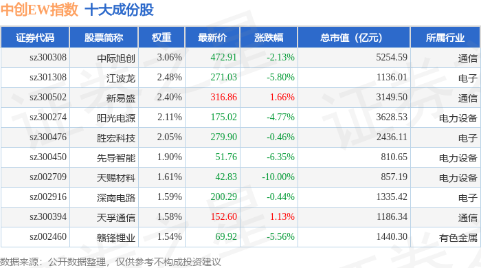 中创EW(399660)指数十大成份股详情如下: