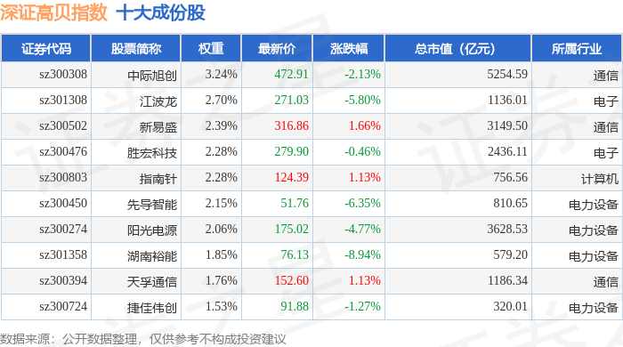 证券之星消息,11月18日,深证高贝(399662)指数报收于2346.75点,跌1.74%,成交2031.77亿元,换手率2.35%。当日该指数成份股中,上涨的有38家,石基信息以9.97%的涨幅领涨,下跌的有61家,新宙邦以11.22%的跌幅领跌。