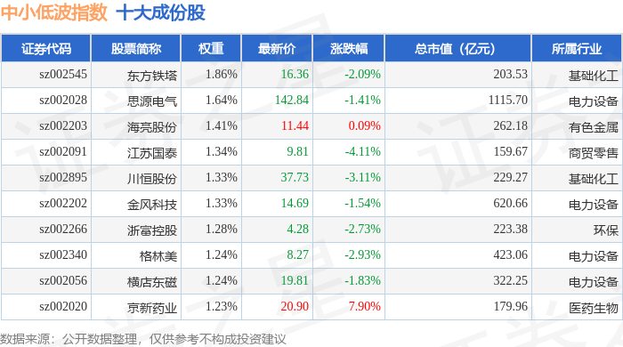 证券之星消息,11月18日,中小低波(399663)指数报收于1982.61点,跌1.14%,成交356.67亿元,换手率1.03%。当日该指数成份股中,上涨的有15家,京新药业以7.9%的涨幅领涨,下跌的有83家,申通快递以5.87%的跌幅领跌。