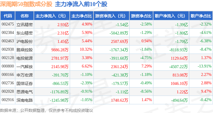 资金流向方面,深周期50(399670)指数成份股当日主力资金净流出合计70.19亿元,游资资金净流入合计24.02亿元,散户资金净流入合计46.18亿元。成份股资金流向详情见下表: