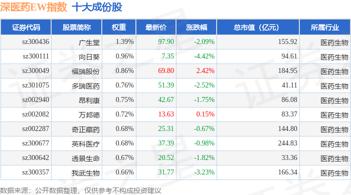 证券之星消息,11月18日,深医药EW(399676)指数报收于3985.32点,跌1.2%,成交568.95亿元,换手率2.73%。当日该指数成份股中,上涨的有41家,诚达药业以20.01%的涨幅领涨,下跌的有174家,富祥药业以14.94%的跌幅领跌。