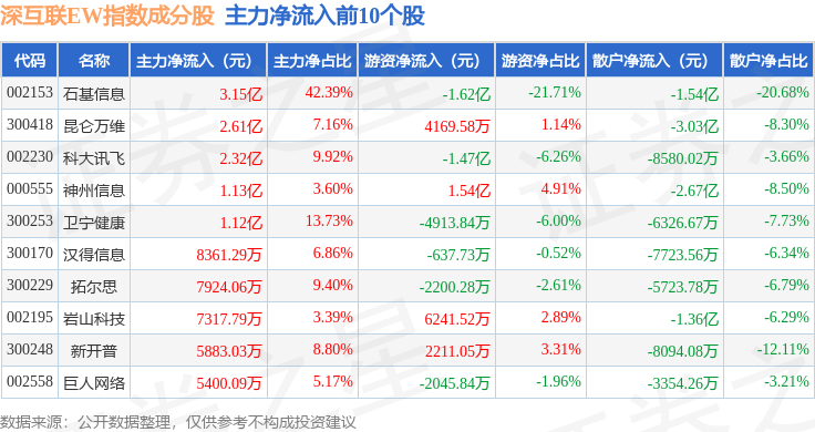 资金流向方面,深互联EW(399677)指数成份股当日主力资金净流入合计11.58亿元,游资资金净流入合计1.01亿元,散户资金净流出合计12.59亿元。成份股资金流向详情见下表: