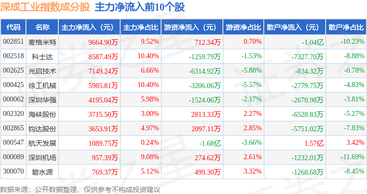 资金流向方面,深成工业(399682)指数成份股当日主力资金净流出合计121.25亿元,游资资金净流入合计32.38亿元,散户资金净流入合计88.87亿元。成份股资金流向详情见下表: