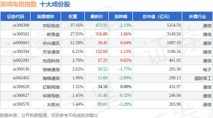 证券之星消息,11月18日,深成电信(399688)指数报收于5295.19点,跌0.37%,成交345.77亿元,换手率2.14%。当日该指数成份股中,上涨的有6家,新易盛以1.66%的涨幅领涨,下跌的有8家,中际旭创以2.13%的跌幅领跌。