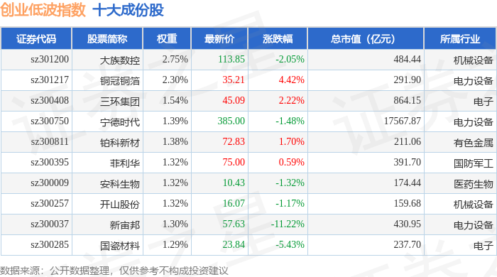 证券之星消息,11月18日,创业低波(399692)指数报收于3921.14点,跌1.02%,成交530.29亿元,换手率1.87%。当日该指数成份股中,上涨的有25家,敷尔佳以9.61%的涨幅领涨,下跌的有73家,立中集团以12.65%的跌幅领跌。