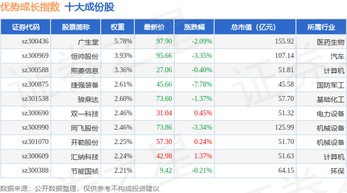 优势成长(399698)指数十大成份股详情如下: