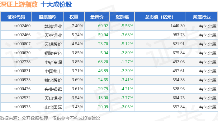 证券之星消息,11月18日,深证上游(399704)指数报收于6196.16点,跌2.76%,成交709.0亿元,换手率3.36%。当日该指数成份股中,上涨的有7家,盛新锂能以4.12%的涨幅领涨,下跌的有43家,立中集团以12.65%的跌幅领跌。
