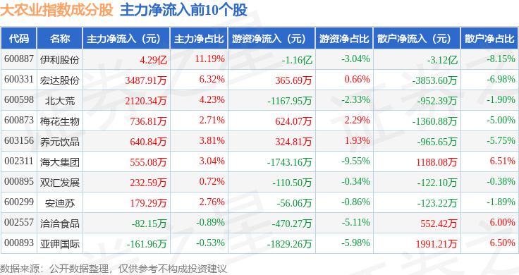 资金流向方面,大农业(399814)指数成份股当日主力资金净流出合计17.42亿元,游资资金净流入合计1.63亿元,散户资金净流入合计15.79亿元。成份股资金流向详情见下表: