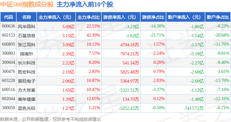 资金流向方面,中证500(399905)指数成份股当日主力资金净流出合计168.6亿元,游资资金净流入合计40.64亿元,散户资金净流入合计127.96亿元。成份股资金流向详情见下表: