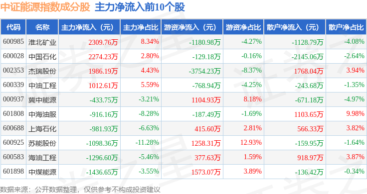 资金流向方面,中证能源(399928)指数成份股当日主力资金净流出合计15.56亿元,游资资金净流入合计3.64亿元,散户资金净流入合计11.92亿元。成份股资金流向详情见下表: