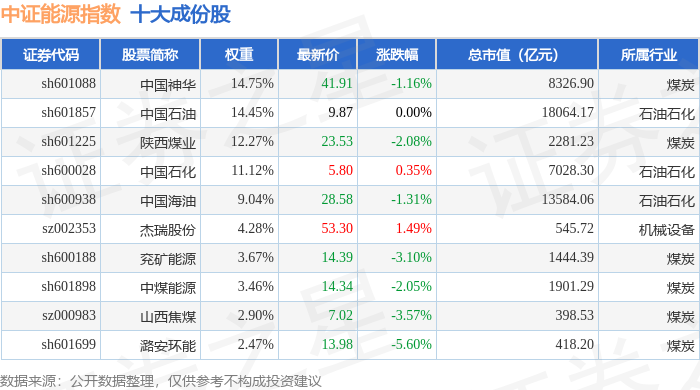 中证能源(399928)指数十大成份股详情如下: