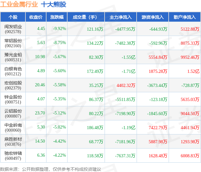 个股表现方面,工业金属行业当日领跌股为闽发铝业(002578),该股当日报收4.45,下跌9.92%,成交量121.16万,主力资金净流出4477.95万元。常铝股份(002160)以下跌8.75%紧随其后,该股当日成交量134.22万,主力资金净流出7482.38万元。除此之外,豫光金铅(600531)、白银有色(601212)、宏创控股(002379)均进入当日熊股之列。具体个股列表见下表:
