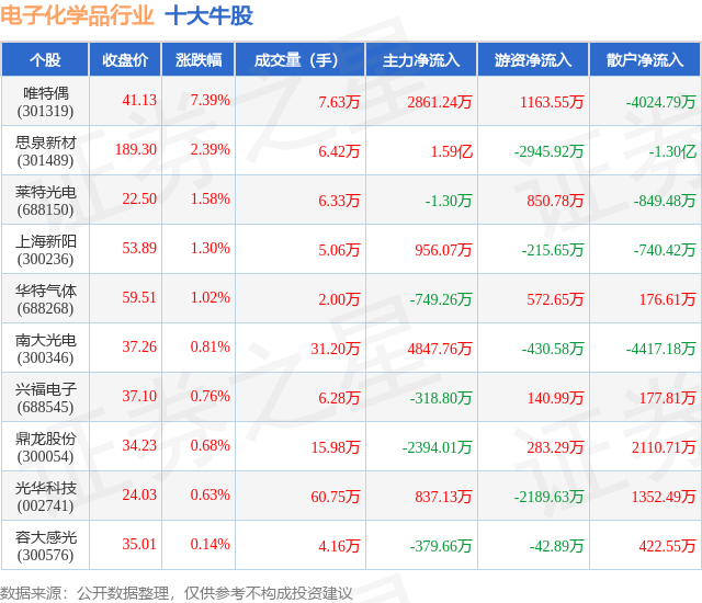 个股表现方面,电子化学品行业当日领涨股为唯特偶(301319),该股当日报收41.13,上涨7.39%,成交量7.63万,主力资金净流入2861.24万元。思泉新材(301489)以上涨2.39%紧随其后,该股当日成交量6.42万,主力资金净流入1.59亿元。除此之外,莱特光电(688150)、上海新阳(300236)、华特气体(688268)均进入当日牛股之列。具体个股列表见下表: