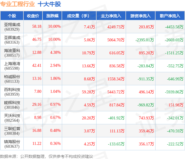 个股表现方面,专业工程行业当日领涨股为亚翔集成(603929),该股当日报收58.18,上涨10.0%,成交量7.41万,主力资金净流入4249.73万元。圣晖集成(603163)以上涨10.0%紧随其后,该股当日成交量5.06万,主力资金净流入5064.7万元。除此之外,海波重科(300517)、上海港湾(605598)、柏诚股份(601133)均进入当日牛股之列。具体个股列表见下表: