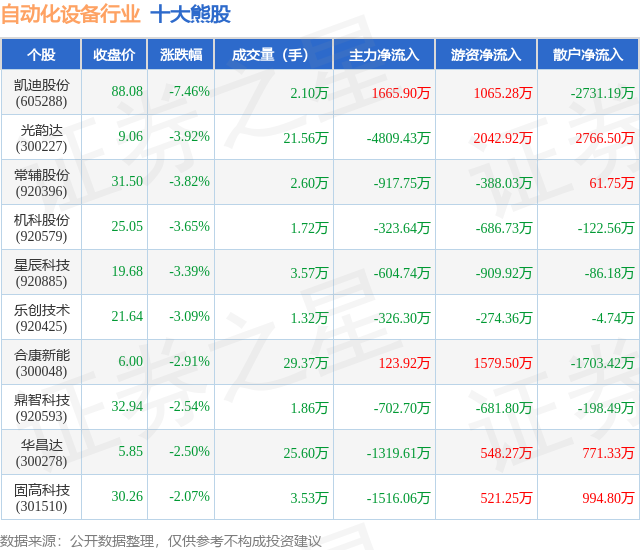 个股表现方面,自动化设备行业当日领跌股为凯迪股份(605288),该股当日报收88.08,下跌7.46%,成交量2.1万,主力资金净流入1665.9万元。光韵达(300227)以下跌3.92%紧随其后,该股当日成交量21.56万,主力资金净流出4809.43万元。除此之外,常辅股份(920396)、机科股份(920579)、星辰科技(920885)均进入当日熊股之列。具体个股列表见下表: